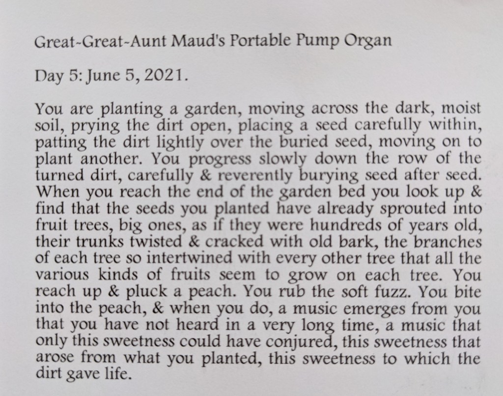 Of course, Maud had no way of knowing that one of her great-nephews, my father, would have a daughter who’d play the halting instrument as a child and then bring it to Oregon in the new millennium and plant a mini orchard there. She couldn’t know that great-great-niece would grow up to be a poet who would subscribe to another poet’s Dream Delivery Service that—in June 2021, as a global pandemic not unlike the 1918 flu continued to circle the globe—would mail her dreams for objects all over the country, including the organ. She couldn’t have known the organ would dream this dream: