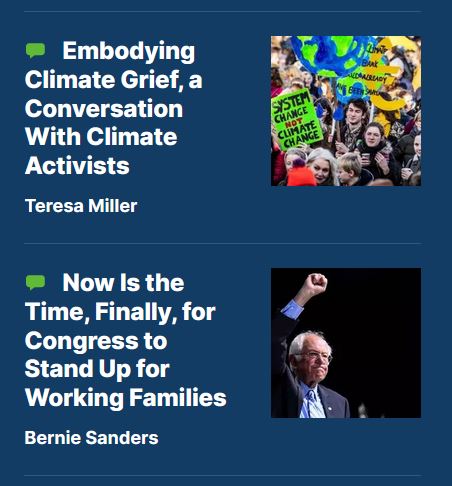 Seattle climatologist Dr. Sarah Myhre and I just published a conversation in Common Dreams and on Resilience.org titled “Embodying Climate Grief,” which gives a comprehensive and accessible overview of the ecological themes in Borderline Fortune. Last Thursday morning, the article appeared alongside an op-ed by Bernie Sanders.